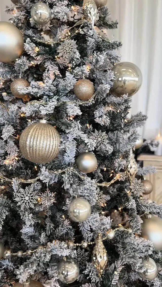 A decorated Christmas tree with silver and gold ornaments, featuring a snow-flocked appearance and string lights, inside a festive room with candles and a decorated fireplace mantel in the background.