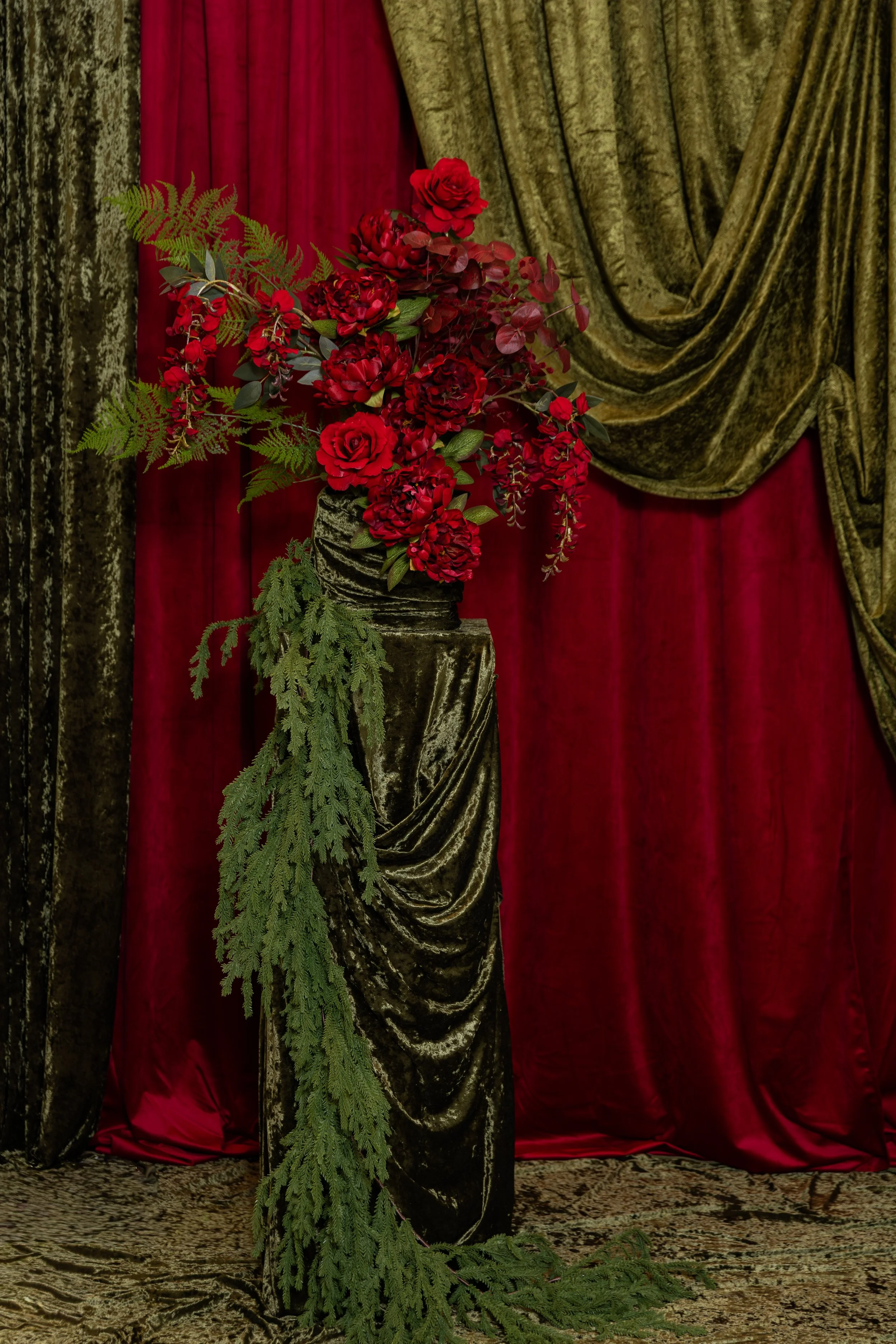 Elegant red and green floral arrangement with velvet drapes backdrop, including a tall pedestal with red roses and greenery, and a smaller bouquet on the floor with similar flowers.